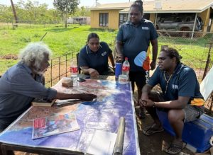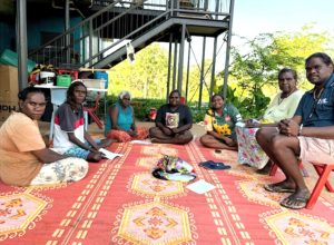 Fig 2. Interviewing senior ladies as part of the Ground Up peacemaking research. Left to right: Latisha Marrayntya, Tynisha Cronin, Angela Wungung, Monica Mishwan, Bridget Kikiden